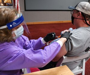 Tammie Litchford, a registered nurse with the Tullahoma office of the Coffee County Health Department, administers a flu vaccine to Charles Champion, a pipefitter at Arnold Air Force Base, Oct. 20, 2021, during a flu vaccine clinic held at Arnold AFB, Tenn. The clinic was conducted by the Coffee