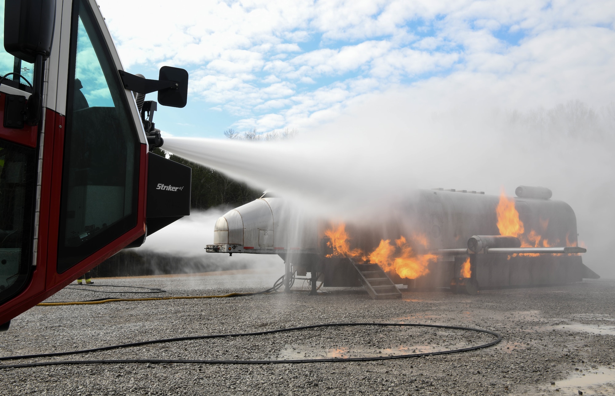 ARNOLD AIR FORCE BASE, Tenn. -- Arnold Air Force Base Fire and Emergency Services personnel trained using an aircraft live fire simulator in mid-February. Live fire training is important for FES team members in order to maintain readiness.