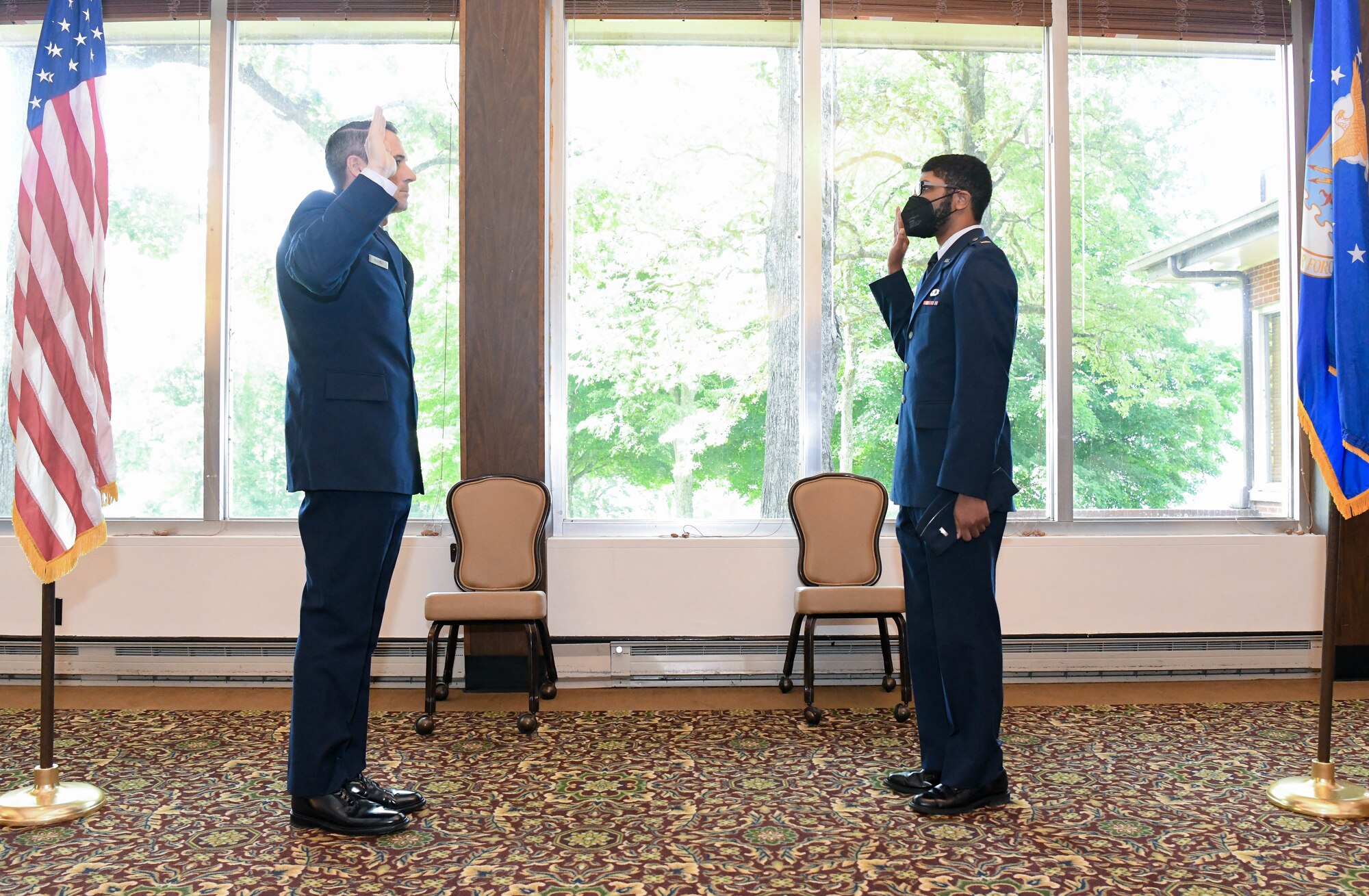 Lt. Col. Lane Haubelt, chief of the Arnold Engineering Development Complex Propulsion Test Branch, left, administers the oath of office to newly-promoted 1st Lt. Gregory Landrum during a promotion ceremony May 21, 2021, at Arnold Air Force Base, Tenn. (U.S. Air Force photo by Jill Pickett)