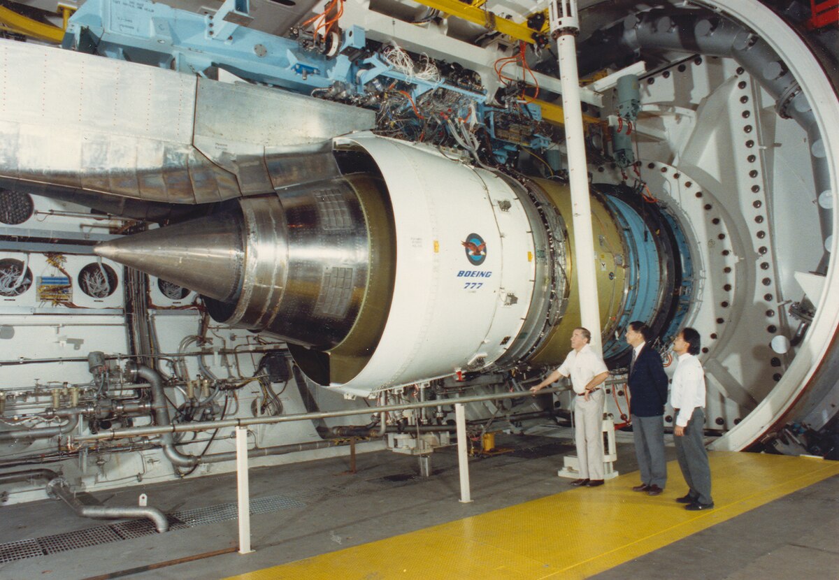 The Pratt & Whitney 4084, which started testing at AEDC in the fall of 1992, was the largest turbine engine ever tested at AEDC at that time. The engine stands 10 feet in height, has a 112-inch diameter fan and a thrust capability in the 73,000 to 90,000-pound range. It was developed to power the Boeing 777. (AEDC photo)
