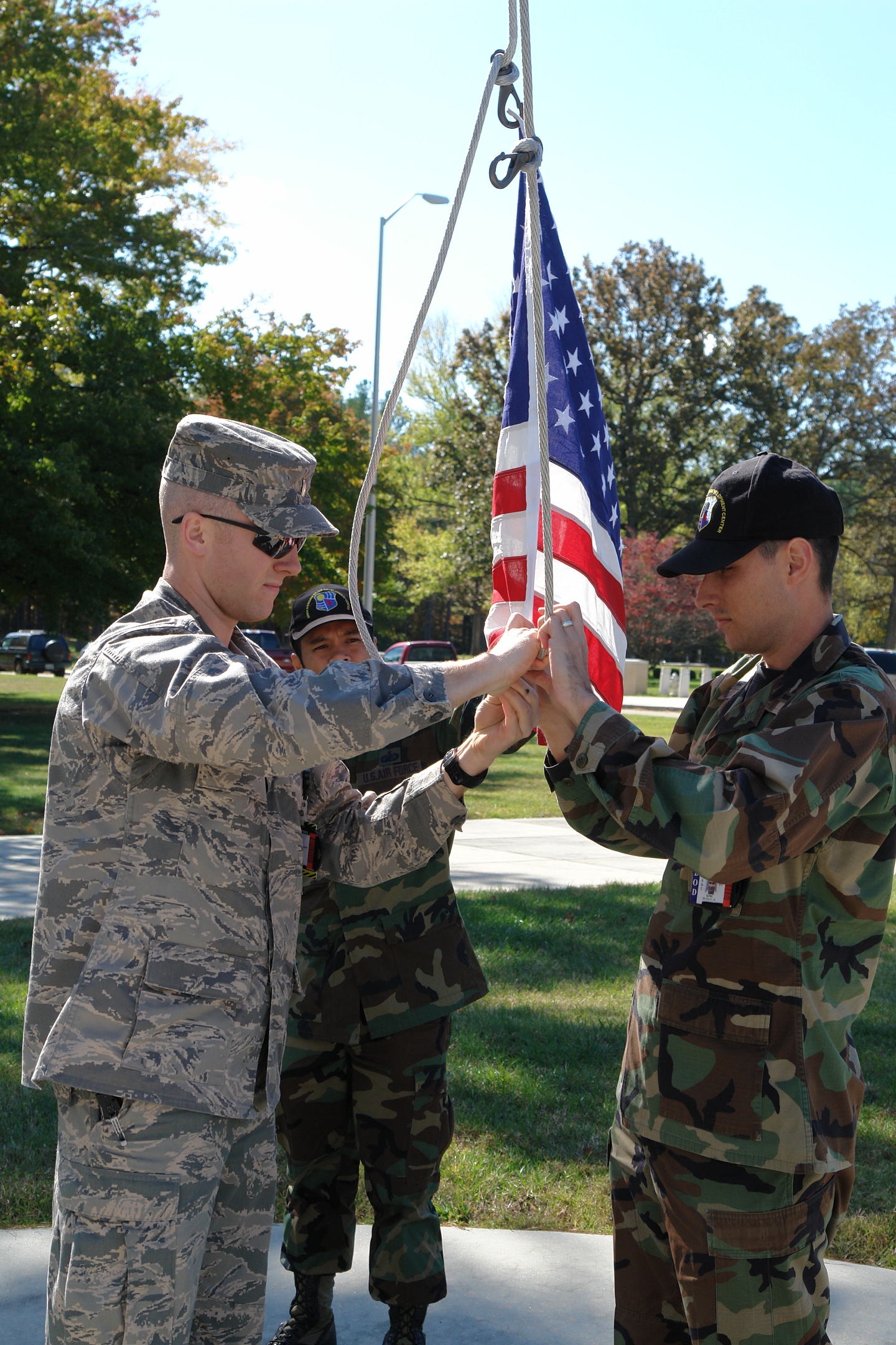 Above, 1st Lt. Alex Hausman, left, Tech Sgt. John Bankston, center, and 1st Lt. Brad King, attach AFMC Commander Gen. Bruce Carlson’s retirement flag to the flagpole so it can be flown at AEDC. (Photo by Whitney Rogers)